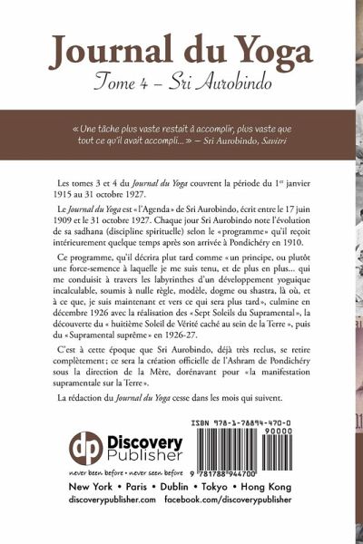 Les tomes 3 et 4 du Journal du Yoga couvrent la période du 1er janvier 1915 au 31 octobre 1927. Le Journal du Yoga est « l'Agenda » de Sri Aurobindo, écrit entre le 17 juin 1909 et le 31 octobre 1927. Chaque jour Sri Aurobindo note l'évolution de sa sadhana (discipline spirituelle) selon le « programme » qu'il reçoit intérieurement quelque temps après son arrivée à Pondichéry en 1910. Ce programme, qu'il décrira plut tard comme « un principe, ou plutôt une force-semence à laquelle je me suis tenu, et de plus en plus... qui me conduisit à travers les labyrinthes d'un développement yoguique incalculable, soumis à nulle règle, modèle, dogme ou shastra, là où, et à ce que, je suis maintenant et vers ce qui sera plus tard », culmine en décembre 1926 avec la réalisation des « Sept Soleils du Supramental », la découverte du « huitième Soleil de Vérité caché au sein de la Terre », puis du « Supramental suprême » en 1926-27. C'est à cette époque que Sri Aurobindo, déjà très reclus, se retire complètement ; ce sera la création officielle de l'Ashram de Pondichéry sous la direction de la Mère, dorénavant pour « la manifestation supramentale sur la Terre ». La rédaction du Journal du Yoga cesse dans les mois qui suivent. Note de l'éditeur : Afin d'être plus agréable lors de la lecture, cet ouvrage est au format Beau Livre, 6"x9", 15x23cm. Dans la même optique, le papier est de couleur crème, ce qui fatigue moins les yeux que le papier blanc. Toutes nos publications font l'objet d'un travail soigné tant au niveau typographique qu'au niveau du design. 348 pages.