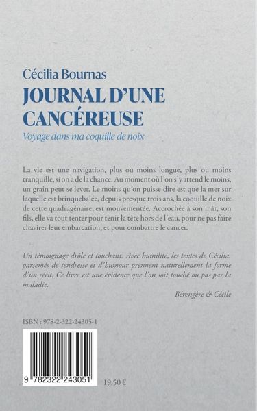 La vie est une navigation, plus ou moins longue, plus ou moins tranquille, si on a de la chance.Au moment où l'on s'y attend le moins, un grain peut se lever.Le moins qu'on puisse dire est que la mer sur laquelle est brinquebalée, depuis presque trois ans, la coquille de noix de cette quadragénaire, est mouvementée.AccrochéE à son mât, son fils, elle va tout tenter pour tenir la tête hors de l'eau, pour ne pas faire chavirer leur embarcation, et pour combattre le cancer.
