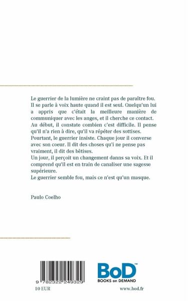 Le guerrier de la lumière ne craint pas de paraître fou.Il se parle à voix haute quand il est seul. Quelqu'un lui aappris que c'était la meilleure manière de communiqueravec les anges, et il cherche ce contact.Au début, il constate combien c'est difficile. Il pense qu'iln'a rien à dire, qu'il va répéter des sottises.Pourtant, le guerrier insiste. Chaque jour il converseavec son coeur. Il dit des choses qu'i ne pense pasvraiment, il dit des bêtises.Un jour, il perçoit un changement danns sa voix. Et ilcomprend qu'il est en train de canaliser une sagessesupérieure.Le guerrier semble fou, mais ce n'est qu'un masque.Paulo Coelho