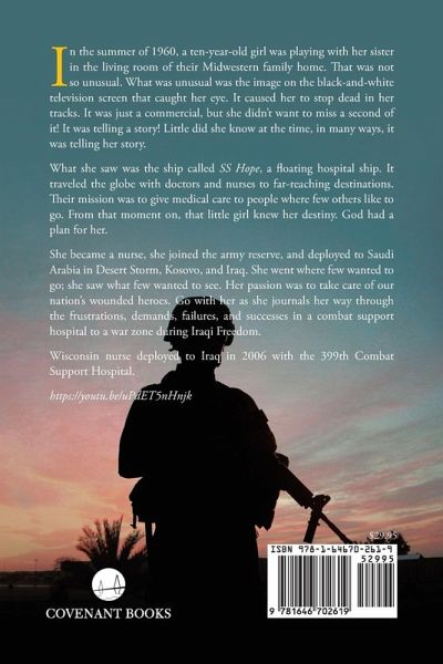 In the summer of 1960, a ten-year-old girl was playing with her sister in the living room of their Midwestern family home. That was not so unusual. What was unusual was the image on the black-and-white television screen that caught her eye. It caused her to stop dead in her tracks. It was just a commercial, but she didn’t want to miss a second of it! It was telling a story! Little did she know at the time, in many ways, it was telling her story. What she saw was the ship called SS Hope, a floating hospital ship. It traveled the globe with doctors and nurses to far-reaching destinations. Their mission was to give medical care to people where few others like to go. From that moment on, that little girl knew her destiny. God had a plan for her. She became a nurse, she joined the army reserve, and deployed to Saudi Arabia in Desert Storm, Kosovo, and Iraq. She went where few wanted to go; she saw what few wanted to see. Her passion was to take care of our nation’s wounded heroes. Go with her as she journals her way through the frustrations, demands, failures, and successes in a combat support hospital to a war zone during Iraqi Freedom. Wisconsin nurse deployed to Iraq in 2006 with the 399th Combat Support Hospital. https://youtu.be/uPdET5nHnjk