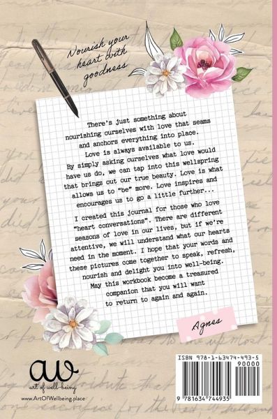 A guided journal for women with 33 prompts on the topic of self-love. I have created this guided journal for those who love "heart conversations". There are different seasons of love in our lives, and if we're attentive, we will understand what our heart needs. I hope that your words and these images come together to speak, refresh, nourish and delight you into well-being. May this become a treasured companion that you will return to again and again. ¿¿¿¿¿¿¿ For more, visit my website at www.ArtOfWellbeing.place to see more of my books, courses and free downloads.