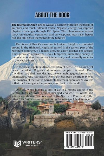 The Journal of Allen Brock weaves a narrative through the twists of an older and much different Earth. Negative energy has imposed physical challenges through Rift Space. This phenomenon wreaks havoc on electrical equipment and on weaponry. Wars rage; heroes rise and fall, hence the weave of the tapestry. The focus of Brock's narrative is Junipero Heights, a contested ground in the Highland. Highland, tucked in the eastern part of the Northern continent, is a rugged area, not easily assailed. For decades it has prevailed against the Hexas, Junipero's unrelenting enemy in the west who view themselves intellectually and culturally superior to the Native-born. In the backdrop stands Brock, the reticent hero. He is no saint, yet never the villain. Rouges and connivers peopled his world. Even friendlies have their agendas. Yet, the overarching questions remain unanswered, Why has victory over the Hexas been deferred? Why is that so many of the Native-born kinfolk remain pressed? How was it that the Hexas gained supremacy over half of the land? One day, while nursing a pint of ale in a remote casino in the Central Mosaic, Brock decides he's had enough. His words and actions reverberate from one end of the Northern Continent to the other. The future is altered, but not in the way Brock had intended.