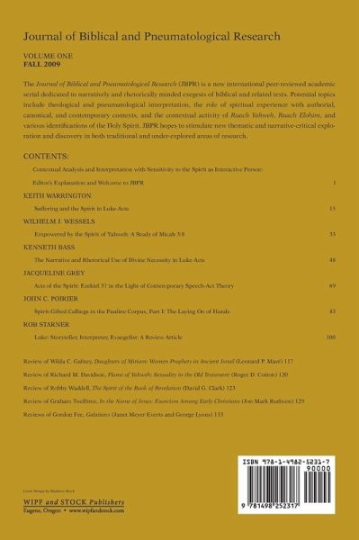 Journal of Biblical and Pneumatological Research VOLUME ONE FALL 2009 The Journal of Biblical and Pneumatological Research (JBPR) is a new international peer-reviewed academic serial dedicated to narratively and rhetorically minded exegesis of biblical and related texts. Potential topics include theological and pneumatological interpretation, the role of spiritual experience with authorial, canonical, and contemporary contexts, and the contextual activity of Ruach Yahweh, Ruach Elohim, and various identifications of the Holy Spirit. JBPR hopes to stimulate new thematic and narrative-critical exploration and discovery in both traditional and under-explored areas of research. CONTENTS: Contextual Analysis and Interpretation with Sensitivity to the Spirit as Interactive Person: Editor's Explanation and Welcome to JBPR KEITH WARRINGTON Suffering and the Spirit in Luke-Acts WILHELM J. WESSELS Empowered by the Spirit of Yahweh: A Study of Micah 3:8 KENNETH BASS The Narrative and Rhetorical Use of Divine Necessity in Luke-Acts JACQUELINE GREY Acts of the Spirit: Ezekiel 37 in the Light of Contemporary Speech-Act Theory JOHN C. POIRIER Spirit-Gifted Callings in the Pauline Corpus, Part I: The Laying On of Hands ROB STARNER Luke: Storyteller, Interpreter, Evangelist: A Review Article Review of Wilda C. Gafney, Daughters of Miriam: Women Prophets in Ancient Israel (Leonard P. Mare) Review of Richard M. Davidson, Flame of Yahweh: Sexuality in the Old Testament (Roger D. Cotton) Review of Robby Waddell, The Spirit of the Book of Revelation (David G. Clark) Review of Graham Twelftree, In the Name of Jesus: Exorcism Among Early Christians (Jon Mark Ruthven) Reviews of Gordon Fee, Galatians (Janet Meyer Everts and George Lyons)