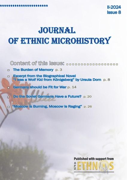 There are five publications in issue 8, II-2024 of "Journal of Ethnic Microhistory". 1. Dr. Winfrid Halder comments in his essay "The Burden of Memory" on the biographical novel "I was a Wolf Kid from Königsberg" (original title in German: "Ich war ein Wolfskind aus Königsberg") by Ursula Dorn. She describes her experiences that cover mainly the period between the summer of 1944 and October 1948. 2. The editorial board has decided to publish the first chapters of the biographical novel "I was a Wolf Kid from Königsberg" by Ursula Dorn to illustrate to some extent the essay "The Burden of Memory" by Dr. Winfrid Halder. This would be continued in the coming issues of the journal. 3. The article "Germany should be Fit for War" by the historian Alex Dreger is devoted to the comparative analyses of the publication dated October 7, 1894, in "Dortmund Newspaper" (Dortmunder Zeitung) that critically examined Wilhelm Liebknecht's speech in the Reichstag, in which one of the leaders of the SPD introduced a proposal for an army reform in accordance with the political views of Marxists on the armed forces. 4. The article "Do the Soviet Germans Have a Future?" is based on the presentation made on 8 October 1989 in Bonn by the leader of the Russia-German movement Hugo Wormsbecher at the congress of the Association for Germanness Abroad (Verein für das Deutschtum im Ausland - VDA). The original text is in German with a preceding English abstract. 5. The analytical treatise "Moscow is Burning, Moscow is Raging" by Robert Korn is devoted to the anti-German Pogroms in Moscow in May 1915. "Economic measures against Russia-Germans, i.e. the destruction of their enterprises and the deprivation of their property led to an acute aggravation of the social situation, first of all, of the Russian people. The deportation of Russia-Germans, who had been ruined and socially humiliated by the authorities, to the overcrowded central and eastern provinces led to a food supplies' crisis." The paper is written in Russian and preceded by an extended English abstract.