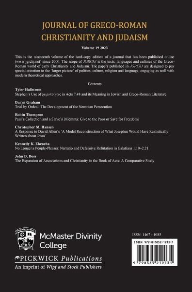 This is the nineteenth volume of the hard-copy edition of a journal that has been published online (www.jgrchj.net) since 2000. The scope of JGRChJ is the texts, languages and cultures of the Greco-Roman world of early Christianity and Judaism. The papers published in JGRChJ are designed to pay special attention to the ‘larger picture’ of politics, culture, religion and language, engaging as well with modern theoretical approaches.