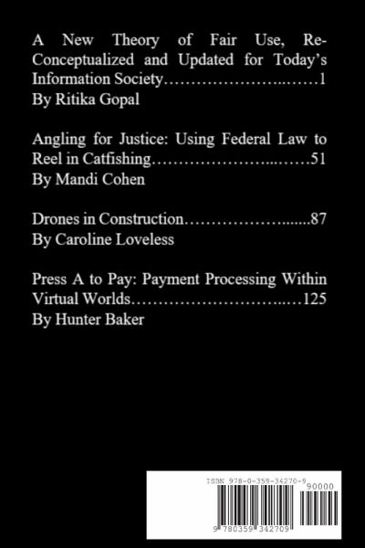 A New Theory of Fair Use, Re-Conceptualized and Updated for Today's Information Society By Ritika Gopal Angling for Justice: Using Federal Law to Reel in Catfishing By Mandi Cohen Drones in Construction By Caroline Loveless Press A to Pay: Payment Processing Within Virtual Worlds By Hunter Baker