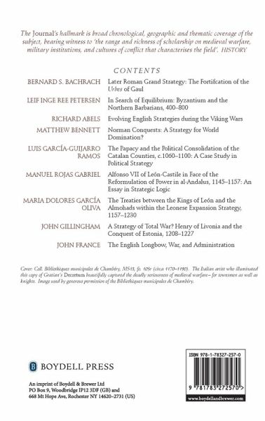 This special edition of the Journal aims to respond to the lively debate in recent years as to whether medieval military history was characterized by particular types of strategy, be it Grand, Vegetian or Battle-Seeking, It brings together many of the pre-eminent military historians active today to examine a number of cases that display the complexity and diversity of strategic realities, as well as exploring new models and methodological avenues in evaluating medieval strategies. Material ranges chronologically from the late Roman Empire to the late Middle Ages, and geographically from the Baltic and the British Isles to Iberia and the Crusader States, while the topics explored include the Viking Wars, the English long bow, and the economies of conquest. Leif Inge Ree Petersen is Associate Professor of Late Antique and Early Medieval History at the Norwegian University of Science and Technology, Trondheim; Manuel Rojas Gabriel is Professor of Medieval History at the University of Extremadura, Caceres. Contributors: Richard Abels, Bernard S. Bachrach, Matthew Bennett, John France, Luis Garcia-Guijarro Ramos, John Gillingham, Dolores Oliva Garcia, Leif Inge Ree Petersen, Manuel Rojas Gabriel.
