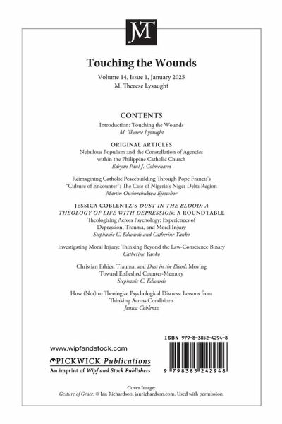 CONTENTS Introduction: Touching the Wounds M. Therese Lysaught ORIGINAL ARTICLES Nebulous Populism and the Constellation of Agencies within the Philippine Catholic Church Edryan Paul J. Colmenares Reimagining Catholic Peacebuilding Through Pope Francis's ""Culture of Encounter"": The Case of Nigeria's Niger Delta Region Martin Owhorchukwu Ejiowhor JESSICA COBLENTZ'S DUST IN THE BLOOD: A THEOLOGY OF LIFE WITH DEPRESSION: A ROUNDTABLE Theologizing Across Psychology: Experiences of Depression, Trauma, and Moral Injury Stephanie C. Edwards and Catherine Yanko Investigating Moral Injury: Thinking Beyond the Law- Conscience Binary Catherine Yanko Christian Ethics, Trauma, and Dust in the Blood: Moving Toward Enfleshed Counter-Memory Stephanie C. Edwards How (Not) to Theologize Psychological Distress: Lessons from Thinking Across Conditions Jessica Coblentz BOOK REVIEWS Roger Bergman, Catholic Social Learning: Educating the Faith That Does Justice Jens Mueller Luke Bretherton, A Primer in Christian Ethics: Christ and the Struggle to Live Well Andrew Blosser Lucas Briola, The Eucharistic Vision of Laudato Si': Praise, Conversion, and Integral Ecology Patrick Nolin D. Glenn Butner, Jr., Jesus the Refugee: Ancient Injustice and Modern Solidarity Thomas Massaro William T. Cavanaugh, Carlos Mendoza-Alvarez, OP, Ikenna Ugochukwu Okafor, and Daniel Franklin E. Pilario, eds., Fratelli Tutti: A Global Commentary Thomas Massaro Geoffrey D. Claussen, Alexander Green, and Alan L. Mittelman, eds., Jewish Virtue Ethics Michael Vanzandt Collins David Carroll Cochran, The Catholic Case Against War: A Brief Guide Marc Tumeinski Holly Taylor Coolman, Parenting: The Complex and Beautiful Vocation of Raising Children Maria C. Morrow Andrew Gustafson and Celeste Harvey, eds., Finding Faith in Business: An Economy of Communion Vision Bernard G. Prusak Christopher J. Kellerman, All Oppression Shall Cease: A History of Slavery, Abolitionism, and the Catholic Church Anna Kasafi Perkins David Chiwon Kwon, Justice After War: Jus Post Bellum in the 21st Century Nicholas Hayes-Mota Leocadie W. Lushombo, A Christian and African Ethic of Women's Political Participation: Living as Risen Beings David Kwon Robert McNamara. The Personalism of Edith Stein: A Synthesis of Thomism and Phenomenology Catherine Moon Joseph Ogbonnaya, ed., Perspectives on Psychic Conversion Steven Umbrello Bharat Ranganathan, On Helping One's Neighbor: Severe Poverty and the Religious Ethics of Obligation Ngoc Nguyen Antonio D. Sison, ed., Deep Inculturation: Global Voices on Christian Faith and Indigenous Genius Joe Evans Andrew M. Yuengert, Catholic Social Teaching in Practice: Exploring Practical Wisdom and the Virtues Ferdinand Tablan