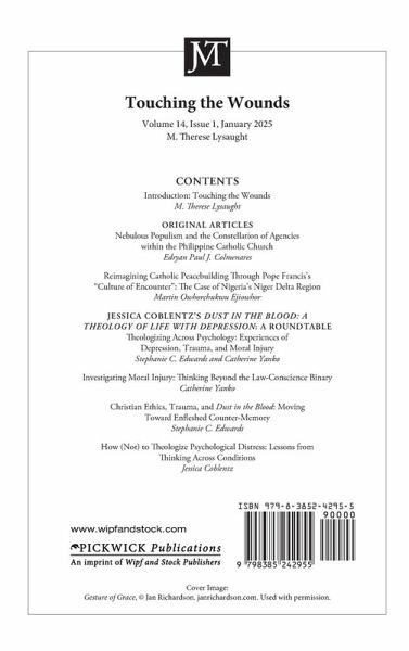CONTENTS Introduction: Touching the Wounds M. Therese Lysaught ORIGINAL ARTICLES Nebulous Populism and the Constellation of Agencies within the Philippine Catholic Church Edryan Paul J. Colmenares Reimagining Catholic Peacebuilding Through Pope Francis's ""Culture of Encounter"": The Case of Nigeria's Niger Delta Region Martin Owhorchukwu Ejiowhor JESSICA COBLENTZ'S DUST IN THE BLOOD: A THEOLOGY OF LIFE WITH DEPRESSION: A ROUNDTABLE Theologizing Across Psychology: Experiences of Depression, Trauma, and Moral Injury Stephanie C. Edwards and Catherine Yanko Investigating Moral Injury: Thinking Beyond the Law- Conscience Binary Catherine Yanko Christian Ethics, Trauma, and Dust in the Blood: Moving Toward Enfleshed Counter-Memory Stephanie C. Edwards How (Not) to Theologize Psychological Distress: Lessons from Thinking Across Conditions Jessica Coblentz BOOK REVIEWS Roger Bergman, Catholic Social Learning: Educating the Faith That Does Justice Jens Mueller Luke Bretherton, A Primer in Christian Ethics: Christ and the Struggle to Live Well Andrew Blosser Lucas Briola, The Eucharistic Vision of Laudato Si': Praise, Conversion, and Integral Ecology Patrick Nolin D. Glenn Butner, Jr., Jesus the Refugee: Ancient Injustice and Modern Solidarity Thomas Massaro William T. Cavanaugh, Carlos Mendoza-Alvarez, OP, Ikenna Ugochukwu Okafor, and Daniel Franklin E. Pilario, eds., Fratelli Tutti: A Global Commentary Thomas Massaro Geoffrey D. Claussen, Alexander Green, and Alan L. Mittelman, eds., Jewish Virtue Ethics Michael Vanzandt Collins David Carroll Cochran, The Catholic Case Against War: A Brief Guide Marc Tumeinski Holly Taylor Coolman, Parenting: The Complex and Beautiful Vocation of Raising Children Maria C. Morrow Andrew Gustafson and Celeste Harvey, eds., Finding Faith in Business: An Economy of Communion Vision Bernard G. Prusak Christopher J. Kellerman, All Oppression Shall Cease: A History of Slavery, Abolitionism, and the Catholic Church Anna Kasafi Perkins David Chiwon Kwon, Justice After War: Jus Post Bellum in the 21st Century Nicholas Hayes-Mota Leocadie W. Lushombo, A Christian and African Ethic of Women's Political Participation: Living as Risen Beings David Kwon Robert McNamara. The Personalism of Edith Stein: A Synthesis of Thomism and Phenomenology Catherine Moon Joseph Ogbonnaya, ed., Perspectives on Psychic Conversion Steven Umbrello Bharat Ranganathan, On Helping One's Neighbor: Severe Poverty and the Religious Ethics of Obligation Ngoc Nguyen Antonio D. Sison, ed., Deep Inculturation: Global Voices on Christian Faith and Indigenous Genius Joe Evans Andrew M. Yuengert, Catholic Social Teaching in Practice: Exploring Practical Wisdom and the Virtues Ferdinand Tablan