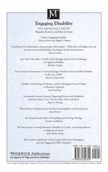 Engaging Disability Edited by Miguel J. Romero and Mary Jo Iozzio Preface: Engaging Disability Mary Jo Iozzio and Miguel J. Romero God Bends Over Backwards to Accommodate Humankind ...While the Civil Rights Acts and the Americans with Disabilities Act Require [Only] the Minimum Mary Jo Iozzio On ""And Vulnerable"": Catholic Social Thought and the Social Challenges of Cognitive Disability Matthew Gaudet From Universal Precautions to Universal Design: Disclosure of Concealable Disability in the Case of HIV Mary M. Doyle Roche Disability, the Healing of Infirmity, and the Theological Virtue of Hope: A Thomistic Approach Paul Gondreau Seventeenth-Century Casuistry Regarding Persons with Disabilities: Antonino Diana's Tract ""On the Mute, Deaf, and Blind"" Julia A. Fleming Blessed Silence: Explorations in Christian Contemplation and Hearing Loss Jana Bennett Becoming Friends: Ethics in Friendship and in Doing Theology Lorraine Cuddeback The Slow Journey Towards Beatitude: Disability in L'Arche, and Staying Human in High-Speed Society Jason Reimer Greig The Goodness and Beauty of Our Fragile Flesh: Moral Theologians and Our Engagement With 'Disability' Miguel J. Romero