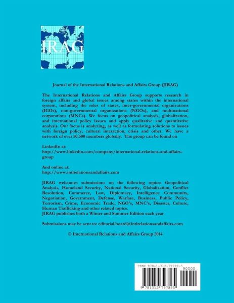 The International Relations and Affairs Group supports research in foreign affairs and global issues among states within the international system, including the roles of states, inter-governmental organizations (IGOs), non-governmental organizations (NGOs), and multinational corporations (MNCs). This edition contains articles related to International Trade, International Law, NGO's, BRICS, Military and Politics, Civil War, National Resources, International Media Relations, CIMIC, Conflict Resolution, Globalization and more.