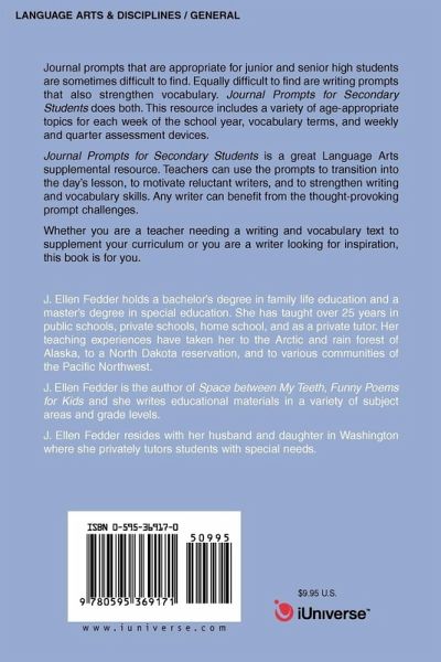 Journal prompts that are appropriate for junior and senior high students are sometimes difficult to find. Equally difficult to find are writing prompts that also strengthen vocabulary. Journal Prompts for Secondary Students does both. This resource includes a variety of age-appropriate topics for each week of the school year, vocabulary terms, and weekly and quarter assessment devices. Journal Prompts for Secondary Students is a great Language Arts supplemental resource. Teachers can use the prompts to transition into the day's lesson, to motivate reluctant writers, and to strengthen writing and vocabulary skills. Any writer can benefit from the thought-provoking prompt challenges. Whether you are a teacher needing a writing and vocabulary text to supplement your curriculum or you are a writer looking for inspiration, this book is for you.