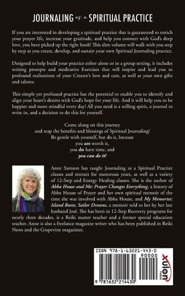 If you are interested in developing a spiritual practice that is guaranteed to enrich your prayer life, increase your gratitude, and help you connect with God's deep love, you have picked up the right book! This slim volume will walk with you step by step as you create, develop, and sustain your own Spiritual Journaling practice. Designed to help build your practice either alone or in a group setting, it includes writing prompts and meditative Exercises that will inspire and lead you to profound realizations of your Creator's love and care, as well as your own gifts and talents. This simple yet profound practice has the potential to enable you to identify and align your heart's desires with God's hope for your life. And it will help you to be happier and more mindful every day! All you need is a willing spirit, a journal to write in, and a decision to do this for yourself. Come along on this journey and reap the benefits and blessings of Spiritual Journaling! Be gentle with yourself, but do it, because you are worth it, you do have time, and you can do it! Anne Samson has taught Journaling as a Spiritual Practice classes and retreats for numerous years, as well as a variety of 12-Step and Energy Healing classes. She is the author of Abba House and Me: Prayer Changes Everything, a history of Abba House of Prayer and her own spiritual memoir of the time she was involved with Abba House, and My Memories: Island Roots, Sailor Dreams, a memoir told to her by her late husband José. She has been in 12-Step Recovery programs for nearly three decades, is a Reiki master teacher and a former special education teacher. Anne is also a freelance magazine writer who has been published in Reiki News and the Grapevine magazines.