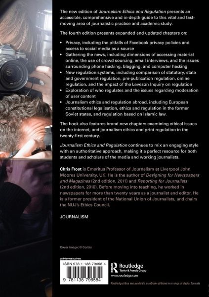 The new edition of Journalism Ethics and Regulation presents an accessible, comprehensive and in-depth guide to this vital and fast moving area of journalistic practice and academic study. The fourth edition presents expanded and updated chapters on: Privacy, including the pitfalls of Facebook privacy policies and access to social media as a source Gathering the news, including dimensions of accessing material online, the use of crowd sourcing, email interviews, and the issues surrounding phone hacking, blagging and computer hacking New regulation systems including comparison of statutory, state and government regulation, pre-publication regulation, online regulation, and the impact of the Leveson Enquiry on regulation Exploration of who regulates and the issues regarding moderation of user content Journalism ethics and regulation abroad, including European constitutional legalisation, ethics and regulation in the former Soviet states, and regulation based on Islamic law. The book also features brand new chapters examining ethical issues on the internet and journalism ethics, and print regulation in the 21st century. Journalism Ethics and Regulation continues to mix an engaging style with an authoritative approach, making it a prefect resource for both students and scholars of the media and working journalists.