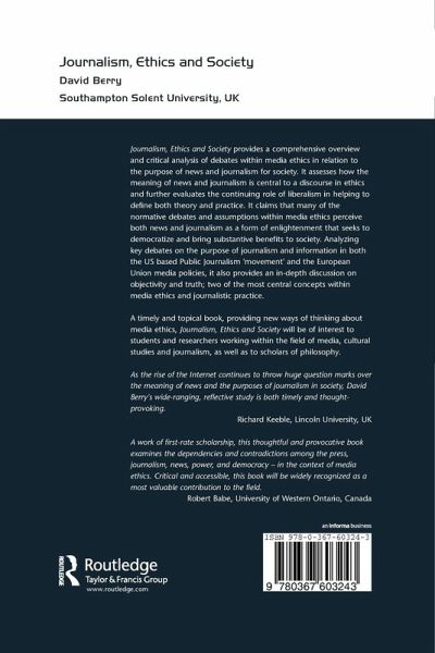 Journalism, Ethics and Society provides a comprehensive overview and critical analysis of debates within media ethics in relation to the purpose of news and journalism for society. It assesses how the meaning of news and journalism is central to a discourse in ethics and further evaluates the continuing role of liberalism in helping to define both theory and practice. Its timely and topical analysis focuses on two of the most central concepts within media ethics and journalistic practice: the US based Public Journalism 'movement' and European Union media policies. It provides new ways of thinking about media ethics and will be of interest to students and researchers working within the field of media, cultural studies and journalism, as well as scholars of philosophy.