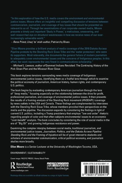This book explores tensions surrounding news media coverage of Indigenous environmental justice issues, identifying them as a fruitful lens through which to examine the political economy of journalism, American history, human rights, and contemporary U.S. politics. The book begins by evaluating contemporary American journalism through the lens of "deep media", focusing especially on the relationship between the drive for profit, professional journalism, and coverage of environmental justice issues. It then presents the results of a framing analysis of the Standing Rock movement (#NODAPL) coverage by news outlets in the USA and Canada. These findings are complemented by interviews with the Standing Rock Sioux Tribe, whose members provided their perspectives on the media and the pipeline. The discussion expands by considering the findings in light of current U.S. politics, including a Trump presidency that employs "law and order" rhetoric regarding people of color and that often subjects environmental issues to an economic "cost-benefit" analysis. The book concludes by considering the role of social media in the era of "Big Oil" and growing Indigenous resistance and power. Examining the complex interplay between social media, traditional journalism, and environmental justice issues, Journalism, Politics, and the Dakota Access Pipeline: Standing Rock and the Framing of Injustice will be of great interest to students and scholars of environmental communication, critical political economy, and journalism studies more broadly.