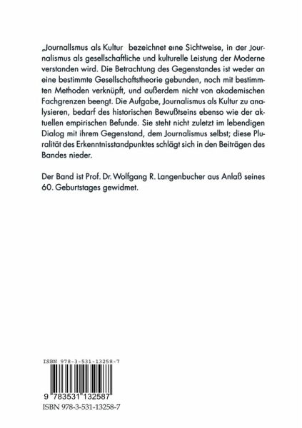 Zur historischen Dimension.- Dortgewesen, wiedergegeben. Zur empirischen Wahrheit der Pressereportage.- Zur Zeitungslektüre der Landarbeiter am Ende des 19. Jahrhunderts. Eine Quellenerkundung.- Auf dem Wege zu den Meerporten. Neue Verkehrswege und Informationsflüsse im 18. Jahrhundert.- Rahmenbedingungen journalistischer Berufskultur.- Journalismus als Suchmaschine. Über den Sinn der Theorie im Chaos der Medienwelt.- Die verspätete Profession: Journalismus zwischen Berufskultur und Digitalisierung.- Ende des Journalismus? Plädoyer für eine umfassende Sichtweise professioneller Kommunikatoren.- Redaktionsstatuten - eine Bilanz nach 30 Jahren.- Amerikanische Perspektiven. Ein Essay über die Zukunft der Medien.- Das Unwandelbare im Journalismus.- Journalistische Genres und Darstellungsweisen als kulturelle Leistungen.- Qualität auf dem Prüfstand. Bedingungen einer kommunikativen Leistungsdiagnostik für Journalismus und Öffentlichkeitsarbeit.- Was heißt journalistische Qualität? Auch ein Versuch zur Bestimmung ihrer Kriterien.- Die Kultur der Kritik der Kultur oder: Zehn Wesensmerkmale des Feuilletons.- "Das Verschwinden der Glühwürmchen" oder: Die Problemfelder und Perspektiven öffentlich-rechtlicher (Radio-)Kunst-und Kulturberichterstattung in Sport-, Spaß- und Spektakelgesellschaften.- Von verständigungsorientierter Öffentlichkeitsarbeit zum diskursiven Journalismus.- Medienjournalismus, Medien-PR und die Corporate Identity von Medienunternehmen. Zielkonflikte zwischen Synergie und Glaubwürdigkeit.- Wissenschaft in den Medien als Politisierungsprozeß. Überlegungen zu einer Neuorientierung in der Wissenschaftskommunikationsforschung.- Rundfunkkultur und Kulturrundfunk.- Rundfunk-Metamorphosen.- Annäherung an eineRundfunk-Institutionsgeschichte.- Medienkultur als Nachfrageproblem?.- Die "kulturelle Verantwortung" des öffentlich-rechtlichen Rundfunks.- Kommunikatororientierte Programmgeschichte und empirische Programmanalyse. Ein kritischer Rückblick auf zehn Jahre Forschung.- Zum Werk von Wolfgang R. Langenbucher.- Wolfgang R. Langenbucher: Bibliographie 1964-1998.- Autorinnen und Autoren.- Herausgeberin und Herausgeber.
