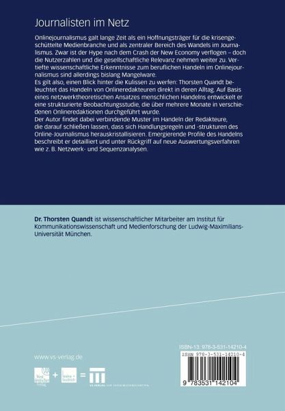 Es gilt also, einen Blick hinter die Kulissen zu werfen: Thorsten Quandt beleuchtet das Handeln von Onlineredakteuren direkt in deren Alltag. Auf Basis eines netzwerktheoretischen Ansatzes menschlichen Handelns entwickelt er eine strukturierte Beobachtungsstudie, die über mehrere Monate in verschiedenen Onlineredaktionen durchgeführt wurde.