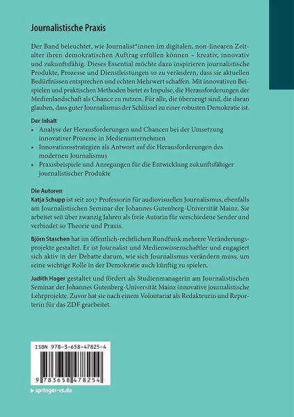 Der Band beleuchtet, wie Journalist_innen im digitalen, non-linearen Zeitalter ihren demokratischen Auftrag erfüllen können kreativ, innovativ und zukunftsfähig. Dieses Essential möchte dazu inspirieren journalistische Produkte, Prozesse und Dienstleistungen so zu verändern, dass sie aktuellen Bedürfnissen entsprechen und echten Mehrwert schaffen. Mit innovativen Beispielen und praktischen Methoden bietet es Impulse, die Herausforderungen der Medienlandschaft als Chance zu nutzen. Für alle, die überzeugt sind, dass guter Journalismus der Schlüssel zu einer robusten Demokratie ist.