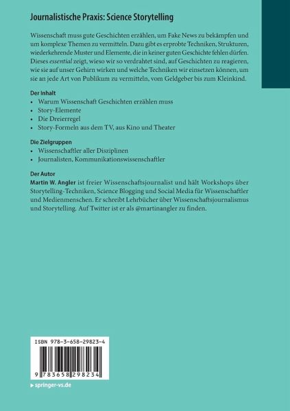 Wissenschaft muss gute Geschichten erzählen, um Fake News zu bekämpfen und um komplexe Themen zu vermitteln. Dazu gibt es erprobte Techniken, Strukturen, wiederkehrende Muster und Elemente, die in keiner guten Geschichte fehlen dürfen. Dieses essential zeigt, wieso wir so verdrahtet sind, auf Geschichten zu reagieren, wie sie auf unser Gehirn wirken und welche Techniken wir einsetzen können, um sie an jede Art von Publikum zu vermitteln, vom Geldgeber bis zum Kleinkind.