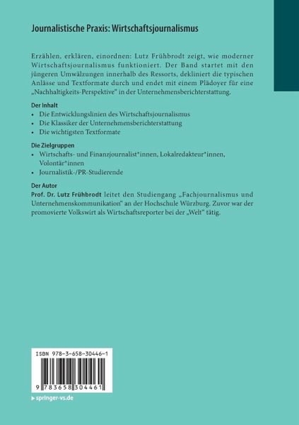 Erzählen, erklären, einordnen: Lutz Frühbrodt zeigt, wie moderner Wirtschaftsjournalismus funktioniert. Der Band startet mit den jüngeren Umwälzungen innerhalb des Ressorts, dekliniert die typischen Anlässe und Textformate durch und endet mit einem Plädoyer für eine "Nachhaltigkeits-Perspektive" in der Unternehmensberichterstattung.