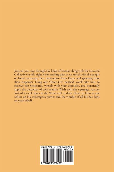 Journal your way through the book of Exodus along with the Devoted Collective in this eight-week reading plan as we travel with the people of Israel, retracing their deliverance from Egypt and gleaning from their responses. Featuring a comprehensive foreword to enhance your contextual understanding of Exodus, this journal is designed to accompany the Reading Through Exodus devotional and to engage both your critical thinking and your creativity. Each weekday you will use the "Three O's" method of connecting with Scripture to record your observations, obstacles, and outcomes from your reading on generously-lined pages with extra-wide margins for illustrations, doodles, or additional notes. With each day's passage, you are invited to seek Jesus in the Word and to draw closer to Him as you reflect on His redemptive power and the wonder of all He has done on your behalf. The Devoted Collective will start reading through Exodus in community on March 20th 2023, for more information on how to join them visit www.thedevotedcollective.org. Features: A comprehensive foreword providing context to Genesis Guided Journal Pages Hand drawn Bespoke Illustrations