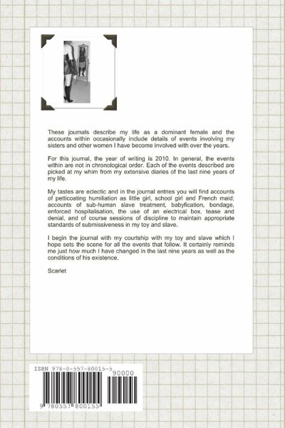 This is volume 1 of my journals which describe my life as a dominant female. I live with my husband, bitch-boy. Bitch-boy is a subjugated, trapped slave and source of amusement. He does all the chores and housework, and fetches and carries and his reward is enforced chastity, humiliation and punishment. For this journal, the year of writing is 2010. In general, the events within are not in chronological order. Each of the events described are picked at my whim from my extensive diaries of the last nine years of my life. My tastes are eclectic and in the journal entries you will find accounts of petticoating humiliation as little girl, school girl and French maid; accounts of sub-human slave treatment, babyfication, bondage, enforced hospitalisation, dickie-discipline, lesbian cuckolding,the use of an electrical box, tease and denial, and of course sessions of discipline to maintain appropriate standards of submissiveness. My BLOG: http://msscarletuk.wordpress.com