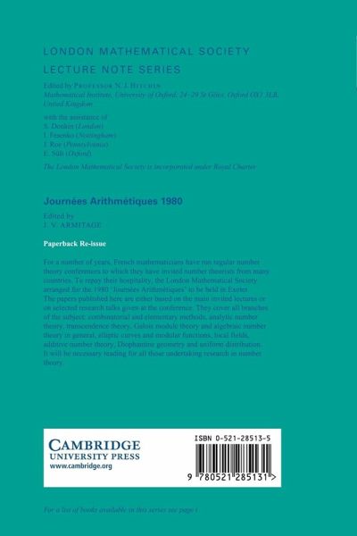 For a number of years, French mathematicians have run regular number theory conferences to which they have invited number theorists from many countries. To repay their hospitality, the London Mathematical Society arranged for the 1980 'Journees Arithmeiques' to be held in Exeter. The papers published here are either based on the main invited lectures or on selected research talks given at the conference. They cover all branches of the subject: combinatorial and elementary methods; analytic number theory; transcendence theory; Galois module theory and algebraic number theory in general; elliptic curves and modular functions; local fields; additive number theory; Diophantine geometry, and uniform distribution. It will be necessary reading for all those undertaking research in number theory.
