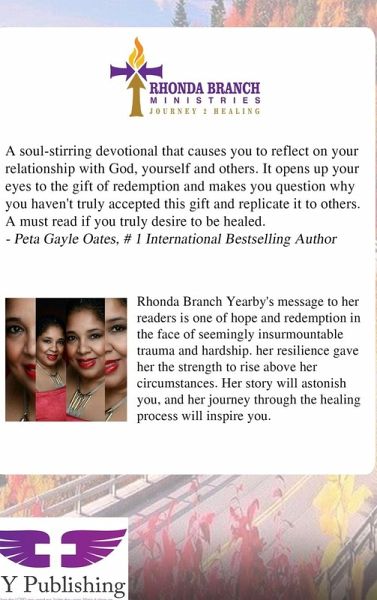 This is a beautiful book to take on the journey to healing. It will walk you through each step. With prayer and scripture to help you overcome. There is also space for your personal journey to unfold. Rhonda Branch Yearby's message to her readers is one of hope and redemption in the face of seemingly insurmountable trauma and hardship. Her resilience gave her the strength to rise above her circumstances. Her story will astonish you, and her journey through the healing process will inspire you.