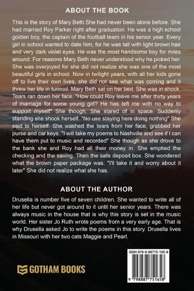 This is the story of Mary Beth. She had never been alone before. She had married Roy Parker right after graduation. He was a high school golden boy, the captain of the football team in his senior year. Every girl in school wanted to date him, for he was tall with light brown hair and very dark violet eyes. He was the most handsome boy for miles around. For reasons Mary Beth never understood why he picked her. She was overjoyed for she did not realize she was one of the most beautiful girls in school. Now in twilight years, with all her kids gone off to live their own lives, she did not see what was coming and it threw her life in turmoil. Mary Beth sat on her bed. She was in shock. Tears ran down her face. How could Roy leave me after thirty years of marriage for some young girl? He has left me with no way to support myself. She though. She stared of in space. Suddenly standing she shook herself. No use staying here doing nothing. She said to herself. She washed the tears from her face, grabbed her purse and car keys. I will take my poems to Nashville and see if I can have them put to music and recorded. She though as she drove to the bank she and Roy had all their money in. She emptied the checking and the saving. Then the safe deposit box. She wondered what the brown paper package was. Ill take it and worry about it later. She did not realize what she has.