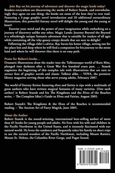 The #1 bestselling Ruin Mist books finally back in print for the 20th Anniversary have been translated into 12 languages and sold over 5 million copies worldwide! This high-quality, deluxe edition features two distinctive cover illustrations, a 3-page graphic novel introduction, and 20 extraordinary illustrations. Exercise your mind and the power of your imagination while embarking on a journey of discovery unlike any other. Journey Beyond the Beyond is a refreshingly unique fantastic adventure that is suitable for readers of all ages while containing all the icky-gooey-creepy details that are sure to delight! Following the village elder's advice, Ray leaves his home village, setting out for the place lost and deep where he will find a companion for his journey to the stone land and where he will discover that there is no easy path from childhood to manhood. ABOUT THE AUTHOR: A gifted and distinguished writer, respected and skilled teacher and recipient of our nation's highest flying honor, the Distinguished Flying Cross, Robert Stanek wrote over 200 books of both fiction and nonfiction in his 30-year career. Although his works were published and/or distributed by nearly every major US publisher, Robert operated against the grain and became the first breakout author of the digital publishing movement. The first to serialize an ebook, the first to e-author a bestseller, and the first to e-author a digital audio bestseller. Robert is the recipient of multiple awards recognizing his outstanding contributions and excellence in writing, and a recent nominee for a Lifetime Achievement award. Translated into 57 languages, Robert Stanek's books have sold nearly 20 million copies worldwide. Achievements for Robert Stanek's Ruin Mist books... #1 Fiction, Audible (12 weeks, 2005) Top 50 Sci-fi/Fantasy, Amazon (26 weeks, 2002) Top 10 Fiction, Audible (25 weeks, 2005) Top 50 Fiction, Audible (52 weeks, 2005-2006) Top 10 Kids & YA, Audible (180 weeks, 2005-2007) #1 Featured Book Audible June-July 2005 Featured in Cover Story, Publisher's Weekly (2009) Featured in VOYA (2007) Featured in Complete Idiots Guide to Elves and Fairies (2005) Featured in Ancient Art of Faery Magick (2005) Popular Series Fiction for Middle School and Teen Readers (2005, 2008) Top 10 Recommended Author -- SciFi Bookcase (2004 - 2012) Top 10 Book -- SciFi Bookcase (2004 - 2012) Top 20 Author -- RateItAll (2005 - 2012) A Top 100 Fantasy -- The Fantasy 100 (2005 - 2007) "Robert Stanek is one of our most featured and respected Kids & Young Adults authors." -- The Audio Book Store "Word of mouth turned it into a bestseller. Very satisfying." -- The Fantasy Guide "Recommended series."-- Ancient Art of Faery Magick "Stanek augments the beginning of this complex tale with illustrations that are sure to attract fans of graphic novels and classic Tolkien alike." -- VOYA - the leading magazine for YA librarians. "A prolific non-fiction writer, Stanek's focus on instruction influences his fiction with a penchant for clear and simple prose. He also prefers swift, action-oriented scenes. Solidly built." -- Foreword Magazine.