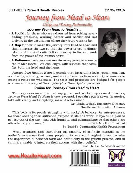 Journey From Head to Heart is... A Toolkit for those who are exhausted from solving neverending problems, working harder and harder and not arriving at the destination where they truly want to be. A Map for how to make the journey from head to heart and then integrate the two so that the power of ego is diminished and the Authentic Self can emerge to live and work from the power of the human spirit. A Reference book you can use for many years to come as the reader meets life's challenges with success that satisfies both the head and the heart. Journey from Head to Heart is exactly that,…mehr