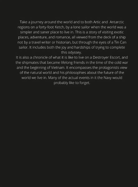 Take a journey around the world and to both Artic and Antarctic regions on a forty-foot Ketch, by a lone sailor when the world was a simpler and saner place to live in. This is a story of visiting exotic places, adventure, and romance, all viewed from the deck of a ship not by a travel writer or historian, but through the eyes of a Tin Can sailor. It includes both the joy and hardships of trying to complete this odyssey. It is also a chronicle of what it is like to live on a Destroyer Escort, and the shipmates that became lifelong friends in the time of the cold war and the beginning of Vietnam. It encompasses the protagonists view of the natural world and his philosophies about the future of the world we live in. Many of the actual events in it the Navy would probably like to forget.