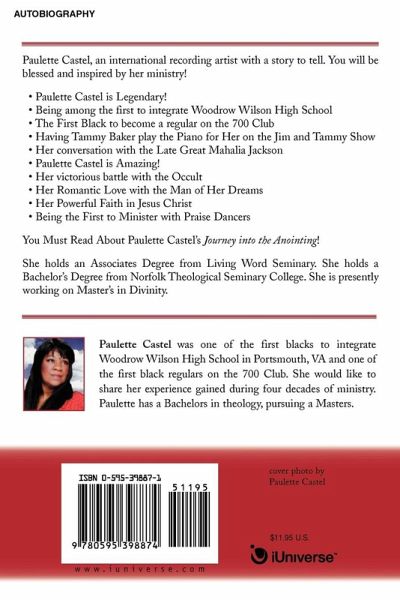 Paulette Castel, an international recording artist with a story to tell. You will be blessed and inspired by her ministry! Paulette Castel is Legendary! *Being among the first to integrate Woodrow Wilson High School *The First Black to become a regular on the 700 Club * Having Tammy Baker play the Piano for Her on the Jim and Tammy Show *Her conversation with the Late Great Mahalia Jackson Paulette Castel is Amazing! * Her victorious battle with the Occult *Her Romantic Love with the Man of Her Dreams *Her Powerful Faith in Jesus Christ *Being the First to Minister with Praise Dancers You Must Read About Paulette Castel's Journey into the Anointing! She holds an Associates Degree from Living Word Seminary. She holds a Bachelor's Degree from Norfolk Theological Seminary College. She is presently working on Master's in Divinity.