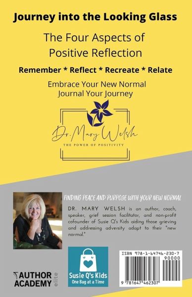 The Four Aspects of Positive Reflection embraces the power of positivity and allows individuals to find the right path to face the adversities of life and embrace their 'new normal' whether it is due to the loss of a loved one, loss of a pet, navigating a divorce or break-up, loss of a job or financial situation, family crisis, personal challenge, physical or mental health issue, self-esteem concern, or need to inspire yourself, etc. Whatever the challenge, the Four Aspects of Positive Reflection helps you come to peace with your 'new normal' and provide hope moving forward as you consider the four aspects: Remembering, Reflecting, Recreating and Relating on your situation and the impact on you and those you hold dear and in the community. Although the ache of losing a loved one cannot be escaped, it can be a catalyst for positive change. In her book, Journey into the Looking Glass: Finding Hope after the Loss of Loved Ones, Dr. Mary described the loss of her daughter Susie, her relationship, the grief process, and how she harnessed the worst moments in her life to create a transparent book of her journey and self-help and discovery topics to aid others in their grieving process. Her strength comes from sharing her story and the hope that others find solace and inspiration on their own journeys with the passion for leading purposeful lives: ¿Remember: Understand Your Past and How Your Loved Ones Impacted You - Remember the Good and Bad Memories ¿Reflect: Understand Your Journey and Path to Grasping the Impact You Had on Your Loved Ones and They Had on You ¿Recreate: Get in Touch with Your Feelings and Come to Grips with Them - Embrace Your New Normal ¿Relate: Make Your Commitment to Living and Your "New Normal" - Practice Self-care, Supporting Others, and Giving Back in the Community. The journal is a good resource for grief reflection therapy whether it is the loss of a loved one, loss of a pet, navigating a divorce or break-up, loss of a job or financial situation, family crisis, personal challenge, physical or mental health issue, self-esteem concern, need to inspire yourself, or other adversity. The Four Aspects of Positive Reflection can be used as a healing journal in grief reflection therapy, reflection therapy coaching yourself to look at things differently, grief support and coaching and in those areas where the purpose of meditation can be found when you are having difficulty expressing emotions and feelings or when providing positive feedback on your own progress is therapeutic. Begin healing today, journal your thoughts and the impact your actions have on you personally and other you care for and in support of local charities and giving back in the community. Dr. Mary Welsh is an author, coach speaker, grief session facilitator, and non-profit co-founder sharing her vast business experience, teaching speaking, and coaching sills to aid grieving parents adapt to their 'new normal' and inspire and brighten the lives of children and young adults with comfort bags through Susie Q's Kids, "One Bag at a Time."