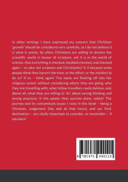 In other writings I have expressed my concern that Christian 'growth' should be considered very carefully, as I do not believe it is what it seems. So often, Christians are willing to dismiss the scientific world in favour of scripture, yet it is in the world of science, that everything is checked, doubled checked, and checked again - so why not scripture and Christianity? Is it because some people think they haven't the time, or the effort, or the intellect to do so? If so - think again! Too many are floating off into the religious sunset without considering where they are going, who they are travelling with, what fellow travellers really believe, and, above all, what they are willing to 'do' about wrong thinking and wrong practices. If this upsets their journey plans, sobeit! The journey and its concomitant issues I raise in this book - being a Christian, Judgement Day and all that incurs, and our final destination - are vitally important to consider, or reconsider - if you dare!