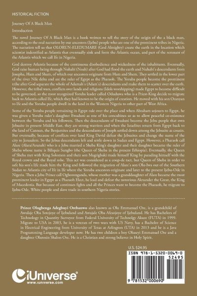 Journey Of A Black Man Introduction The novel Journey Of A Black Man is a book written to tell the story of the origin of the a black man, according to the oral narration by our ancestors (Ijebu) people who are one of the prominent tribes in Nigeria. The narration tell us that OLORUN-ELEDUMARE (God Almighty) create the earth in the location which scientist indentifi ed as Atlantis that eventually sink and form the Atlantic ocean, and part of the remnant of the Atlantis which we call Ife in Nigeria. God destroy Atlantis because of the continuous disobedience and wickedness of the inhabitants. Eventually, God raise human being through Nuhabi (Noah) after God had flood the earth and Nuhabi's descendants from Josepha, Ham and Sham, of which our ancestors originate from Ham and Shem. They settled in the lower part of the river Nile delta and are the ruler of Egypt as the Pharaoh. The Yoruba people become the prominent tribe after God separate the whole of Adamah's (Adam's) descendants and make them to scatter over the earth. However, the tribal wars, conflicts over lands and religions (Idols worshipping) made Egypt to become difficult to be governed, so the most recognized Yoruba leader called Oduduwa who is a Priest-King decide to migrate back to Atlantis called Ife, which they had known to be the origin of creation. He moved with his son Oranyan to Ife and the Yoruba people dwell in the land in the Western Nigeria to other part of West Africa. Some of the Yoruba people remaining in Egypt rule over the place and when Abraham sojourn to Egypt, he was given a Yoruba ruler's daughter Ewaduni as one of his concubines so as to allow peaceful co-existence between the Yoruba and his followers. Then the descendants of Ewaduni become the Jebu people that own Jebusite in present Middle East, they are strong warriors and when the Israelites return from Egypt back to the land of Cannan, the Benjamites and the descendants of Joseph settled down among the Jebusite as cousin. But eventually, because of confl icts over land King David defeat the Jebusites and change the name of the city to Jerusalem. So the Jebus descendants left and settle down in Sudan and Egypt. However, a Pharaoh call Alare(Alara/Arunah) who is a Jebu married a Sheba King's daughter and their daughter became the ruler of Sheba whose name is Biliquis Sungbo(the Queen of Sheba in the present Ethiopia). Eventually, the Queen of Sheba met with King Solomon and their son Magrigbaki made himself King by parading himself with the Royal crown and the Royal robe. Th is act was considered as a coup-de tact, but Queen of Sheba in order to safe his son's life made him the King and followed the migration of Alare's son Olu-Iwa out of the Southern Sudan to Atlantis city of Ife in Ife where the Yoruba ancestors originate and later to the present Ijebu-Ode in Nigeria. Th en a Jebu Prince call Ogboronganda, whose mother was a granddaughter of Alare became the most prominent lea