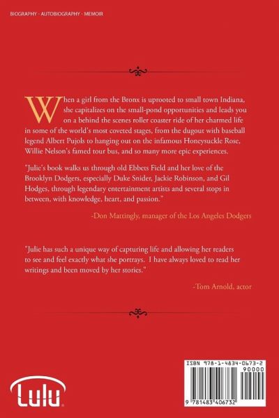 When a girl from the Bronx is uprooted to small town Indiana, she capitalizes on the small-pond opportunities and leads you on a behind the scenes roller coaster ride of her charmed life in some of the world's most coveted stages, from the dugout with baseball legend Albert Pujols to hanging out on the infamous Honeysuckle Rose, Willie Nelson's famed tour bus, and so many more epic experiences. "Julie's book walks us through old Ebbets Field and her love of the Brooklyn Dodgers, especially Duke Snider, Jackie Robinson, and Gil Hodges, through legendary entertainment artists and several stops in between, with knowledge, heart, and passion." -Don Mattingly, manager of the Los Angeles Dodgers "Julie has such a unique way of capturing life and allowing her readers to see and feel exactly what she portrays. I have always loved to read her writings and been moved by her stories." -Tom Arnold, actor