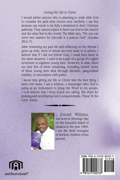 Giving My Life to Christ I would advise anyone who is planning to walk with God to consider the path they choose very carefully. I say this because one needs to be fully committed in their Christian pathway. They cannot expect to have one foot in the church and the other feet in the world. The Bible says, "No one can serve two masters for Jehovah is a jealous God" (Exodus 20:3-7). After reviewing my past life and reflecting on the friends I grew up with, most of whom are now dead or in prison, I believe that if I did not follow God, I could have been in the same situation. I used to be a part of a group of roughly seventeen to eighteen young men. However, to date, there are only five of them remaining, including myself. Some of these young men died through illnesses, gang-related warfare, or encounters with police. I know that giving my life to Christ was the best thing I have ever done. I am a witness, a messenger who God is using as an instrument to bring the Word to his people. I now believe that I have found my calling. My thirst for praising and worshiping God is unquenchable. Praise Ye the Lord. Amen.