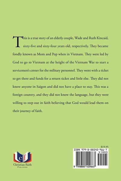 This is a true story of an elderly couple, Wade and Ruth Kincaid, sixty-five and sixty-four years old, respectively. They became fondly known as Mom and Pop when in Vietnam. They were led by God to go to Vietnam at the height of the Vietnam War to start a servicemen's center for the military personnel. They went with a ticket to get there and funds for a return ticket and little else. They did not know anyone in Saigon and did not have a place to stay. This was a foreign country, and they did not know the language, but they were willing to step out in faith believing that God would lead them on their journey of faith