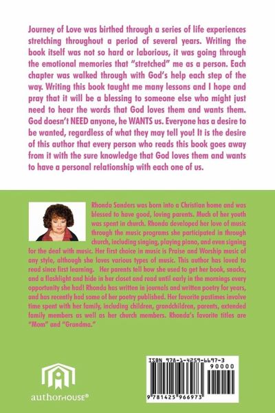 Journey of Love was birthed through a series of life experiences stretching throughout a period of several years. Writing the book itself was not so hard or laborious, it was going through the emotional memories that "stretched" me as a person. Each chapter was walked through with God's help each step of the way. Writing this book taught me many lessons and I hope and pray that it will be a blessing to someone else who might just need to hear the words that God loves them and wants them. God doesn't NEED anyone, he WANTS us. Everyone has a desire to be wanted, regardless of what they may tell you! It is the desire of this author that every person who reads this book goes away from it with the sure knowledge that God loves them and wants to have a personal relationship with each one of us.