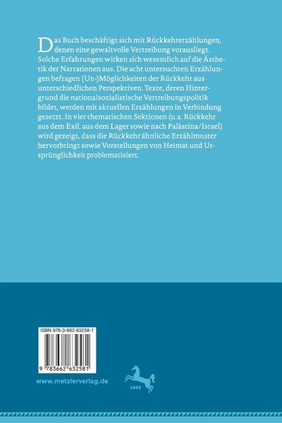 Diese literaturwissenschaftliche Studie beschäftigt sich mit Rückkehrerzählungen, denen eine gewaltvolle Vertreibung vorausliegt. Erfahrungen der erzwungenen Entortung und der anschließenden Rückkehr prägen nicht nur die Handlung von Texten, sondern wirken sich auch auf die Ästhetik der Narrationen aus. Die acht untersuchten Erzähltexte (u.a. von Anna Seghers, Abbas Khider, Peter Weiss, Primo Levi, Herta Müller und Doron Rabinovici) befragen (Un-)Möglichkeiten der Rückkehr aus unterschiedlichen Perspektiven. Texte, die vor dem Hintergrund der nationalsozialistischen Vertreibungspolitik entstanden sind, werden mit aktuellen Erzählungen in Verbindung gesetzt. In vier thematischen Sektionen (u.a. Rückkehr aus dem Exil, aus dem Lager sowie nach Palästina/Israel) wird gezeigt, dass die Rückkehr in unterschiedlichen Kontexten ähnliche Erzählmuster hervorbringt sowie Vorstellungen von Heimat und Ursprünglichkeit problematisiert