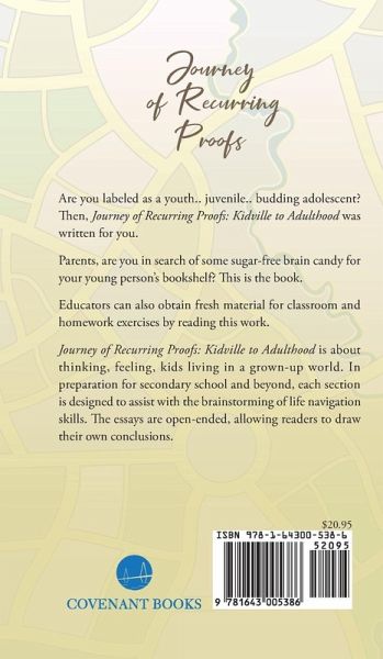 Are you labeled as a youth... juvenile... budding adolescent? Then, Journey of Recurring Proofs: Kidville to Adulthood was written for you. Parents, are you in search of some sugar-free brain candy for your young person's bookshelf? This is the book. Educators can also obtain fresh material for classroom and homework exercises by reading this work. Journey of Recurring Proofs: Kidville to Adulthood is about thinking, feeling, kids living in a grown-up world. In preparation for secondary school and beyond, each section is designed to assist with the brainstorming of life navigation skills. The essays are open-ended, allowing readers to draw their own conclusions.