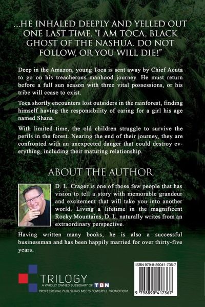 ...HE INHALED DEEPLY AND YELLED OUT ONE LAST TIME, "I AM TOCA, BLACK GHOST OF THE NASHUA. DO NOT FOLLOW, OR YOU WILL DIE!" Deep in the Amazon, young Toca is sent away by Chief Acuta to go on his treacherous manhood journey. He must return before a full sun season with three vital possessions, or his tribe will cease to exist. Toca shortly encounters lost outsiders in the rainforest, finding himself having the responsibility of caring for a girl his age named Shana. With limited time, the old children struggle to survive the perils in the forest. Nearing the end of their journey, they are confronted with an unexpected danger that could destroy everything, including their maturing relationship.