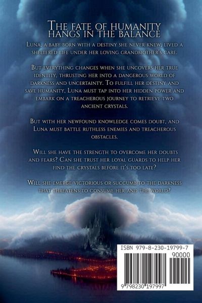 The fate of humanity hangs in the balance Luna, a baby born with a destiny she never knew, lived a sheltered life under her loving grandmother's care. But everything changes when she uncovers her true identity, thrusting her into a dangerous world of darkness and uncertainty. To fulfill her destiny and save humanity, Luna must tap into her hidden power and embark on a treacherous journey to retrieve two ancient crystals. But with her newfound knowledge comes doubt, and Luna must battle her inner demons as she faces ruthless enemies and treacherous obstacles. Will she have the strength to overcome her doubts and fears? Can she trust her loyal guards to help her find the crystals before it's too late? Will she emerge victorious or succumb to the darkness that threatens to consume her and the world?