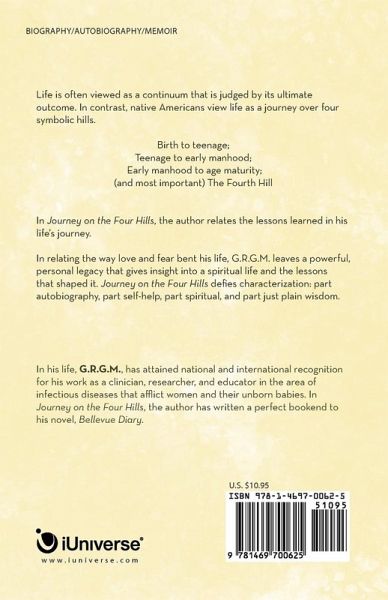 Life is often viewed as a continuum that is judged by its ultimate outcome. In contrast, native Americans view life as a journey over four symbolic hills. Birth to teenage; Teenage to early manhood; Early manhood to age maturity; (and most important) The Fourth Hill In Journey on the Four Hills, the author relates the lessons learned in his life's journey. In relating the way love and fear bent his life, G.R.G.M. leaves a powerful, personal legacy that gives insight into a spiritual life and the lessons that shaped it. Journey on the Four Hills defies characterization: part autobiography, part self-help, part spiritual, and part just plain wisdom.