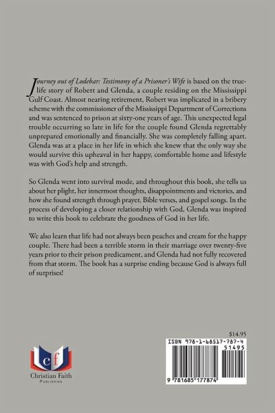 Journey out of Lodebar: Testimony of a Prisoner's Wife is based on the true-life story of Robert and Glenda Simmons, a couple residing on the Mississippi Gulf Coast. Almost nearing retirement, Robert was implicated in a bribery scheme with the commissioner of the Mississippi Department of Corrections and was sentenced to prison at sixty-one years of age. This unexpected legal trouble occurring so late in life for the couple found Glenda regrettably unprepared emotionally and financially. She was completely falling apart. Glenda was at a place in her life in which she knew that the only way she would survive this upheaval in her happy, comfortable home and lifestyle was with God's help and strength. So Glenda went into survival mode, and throughout this book, she tells us about her plight, her innermost thoughts, disappointments and victories, and how she found strength through prayer, Bible verses, and gospel songs. In the process of developing a closer relationship with God, Glenda was inspired to write this book to celebrate the goodness of God in her life. We also learn that life had not always been peaches and cream for the happy couple. There had been a terrible storm in their marriage over twenty-five years prior to their prison predicament, and Glenda had not fully recovered from that storm. The book has a surprise ending because God is always full of surprises!