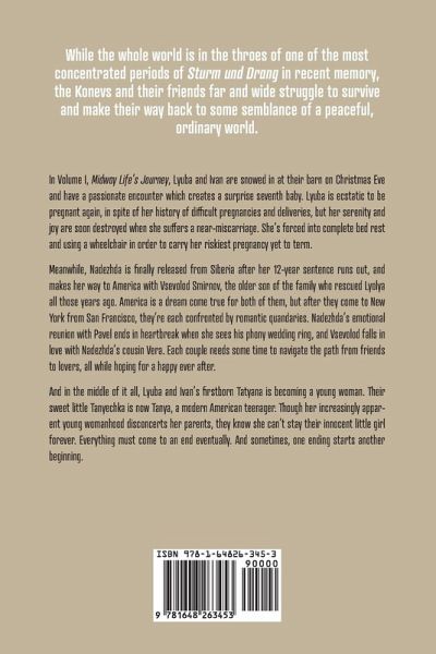 While the whole world is in the throes of one of the most concentrated periods of Sturm und Drang in recent memory, the Konevs and their friends far and wide struggle to survive and make their way back to some semblance of a peaceful, ordinary world. In Volume I, Midway Life's Journey, Lyuba and Ivan are snowed in at their barn on Russian Christmas Eve and have a passionate encounter which creates a surprise seventh baby. Lyuba is ecstatic to be pregnant again, despite her history of difficult pregnancies and deliveries, but her sense of serenity and joy is soon destroyed when she suffers a near-miscarriage. She's forced into complete bed rest and using a wheelchair in order to carry her riskiest pregnancy yet to term. Meanwhile, Nadezhda is finally released from Siberia after her 12-year sentence runs out, and makes her way to America with Vsevolod Smirnov, the older son of the family who rescued Lyolya all those years ago. America is a dream come true for both of them, but after they come to New York from San Francisco, they're each confronted by romantic quandaries. Nadezhda's emotional reunion with Pavel ends in heartbreak when she sees the phony wedding ring he bought, and Vsevolod falls in love with Nadezhda's spinster cousin Vera. Each couple needs some time to navigate the path from friends to lovers, all while hoping for a happy ever after. And in the middle of it all, Lyuba and Ivan's firstborn Tatyana has begun growing up and becoming a young woman. Their sweet little girl Tanyechka is now a modern American teenager who goes by Tanya. Though her increasingly apparent young womanhood disconcerts her parents, they know she can't stay their innocent little girl forever. Everything must come to an end eventually. And sometimes, one ending starts another beginning.