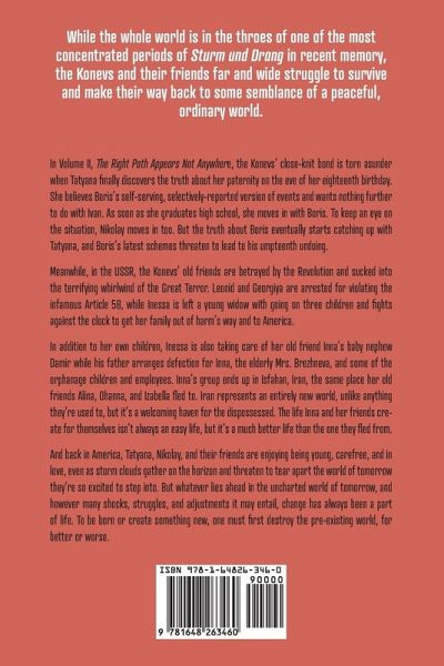 While the whole world is in the throes of one of the most concentrated periods of Sturm und Drang in recent memory, the Konevs and their friends far and wide struggle to survive and make their way back to some semblance of a peaceful, ordinary world. In Part II, The Right Path Appears Not Anywhere, the Konevs' close-knit bond is torn asunder when Tatyana finally discovers the truth about her paternity on the eve of her eighteenth birthday. She believes Boris's self-serving, selectively-reported version of events and wants nothing further to do with Ivan. As soon as she graduates high school, she moves in with Boris. To keep an eye on the situation, Nikolay moves in too. But the truth about Boris eventually starts catching up with Tatyana, and Boris's latest schemes threaten to lead to his umpteenth undoing. Meanwhile, in the USSR, the Konevs' old friends are betrayed by the Revolution and sucked into the terrifying whirlwind of the Great Terror. Leonid and Georgiya are arrested for violating the infamous Article 58, while Inessa is left a young widow with going on three children and fights against the clock to get her family out of harm's way and to America. In addition to her own children, Inessa is also taking care of her old friend Inna's baby nephew Damir while his father arranges defection for Inna, the elderly Mrs. Brezhneva, and some of the orphanage children and employees. Inna's group ends up in Isfahan, Iran, the same place her old friends Alina, Ohanna, and Izabella fled to. Iran represents an entirely new world, unlike anything they're used to, but it's a welcoming haven for the dispossessed. The life Inna and her friends create for themselves isn't always an easy life, but it's a much better life than the one they fled from. And back in America, Tatyana, Nikolay, and their friends are enjoying being young, carefree, and in love, even as storm clouds gather on the horizon and threaten to tear apart the world of tomorrow they're so excited to step into. But whatever lies ahead in the uncharted world of tomorrow, and however many shocks, struggles, and adjustments it may entail, change has always been a part of life. To be born or create something new, one must first destroy the pre-existing world, for better or worse.