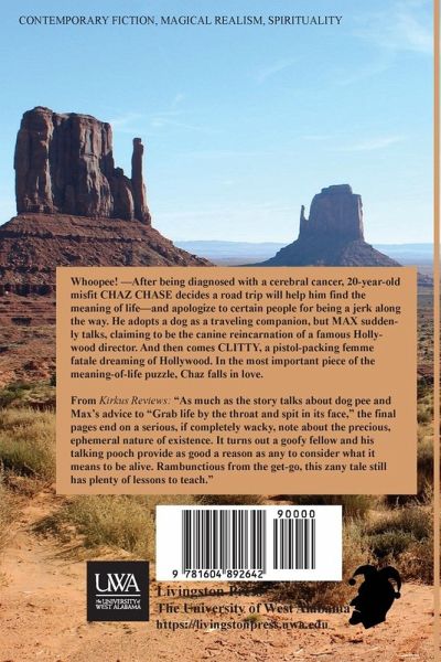 Fiction. Film. After being diagnosed with three months to live, 20 year old misfit Chaz Chase decides a road trip will help him find the meaning of life--and maybe apologize to certain people for being a jerk along the way. He adopts a dog as a traveling companion, but questions his own sanity when Max suddenly talks, claiming to be the reincarnation of a famous Hollywood director. Chaz meets many colorful characters along his journey, some bordering on hallucinogenic in the actions they perform, the wisdom they proclaim. And then comes Clitty, a pistol-packing femme fatale dreaming of Hollywood stardom. In the most important piece of the wisdom puzzle, Chaz falls in love. Together he and Clitty drive to Salton Sea where a reincarnated Max directs the final scene of Chaz's brief but quirky life.